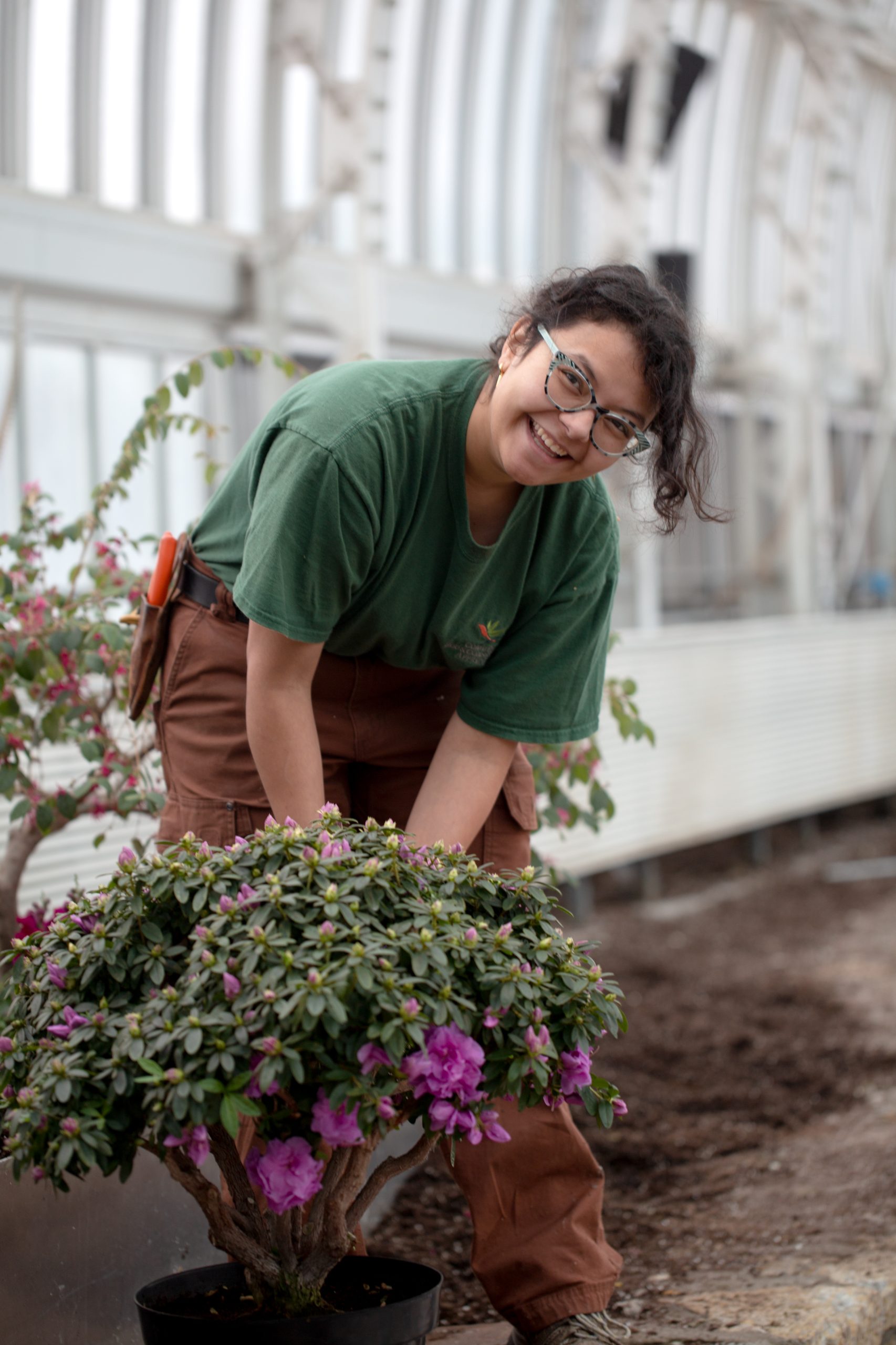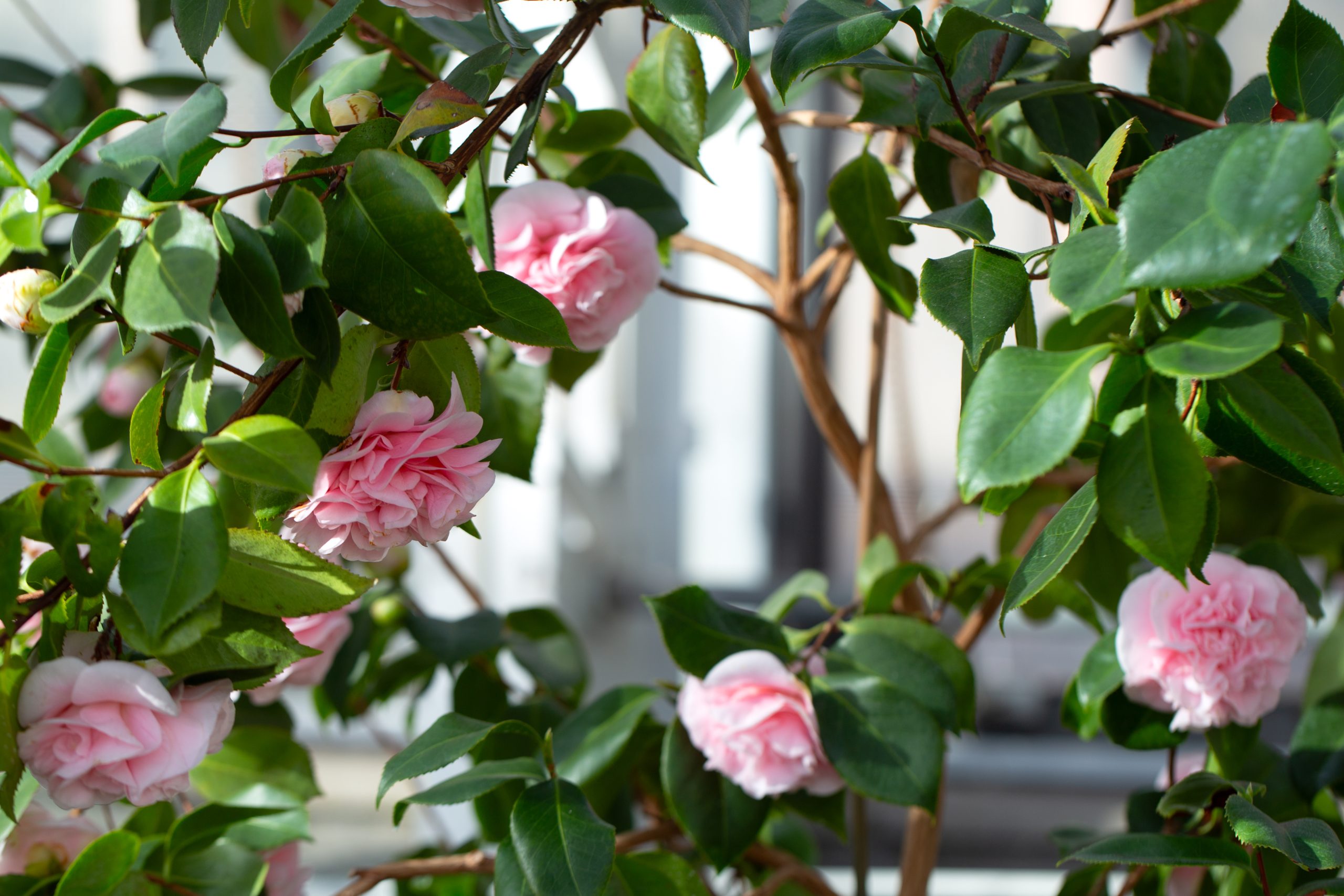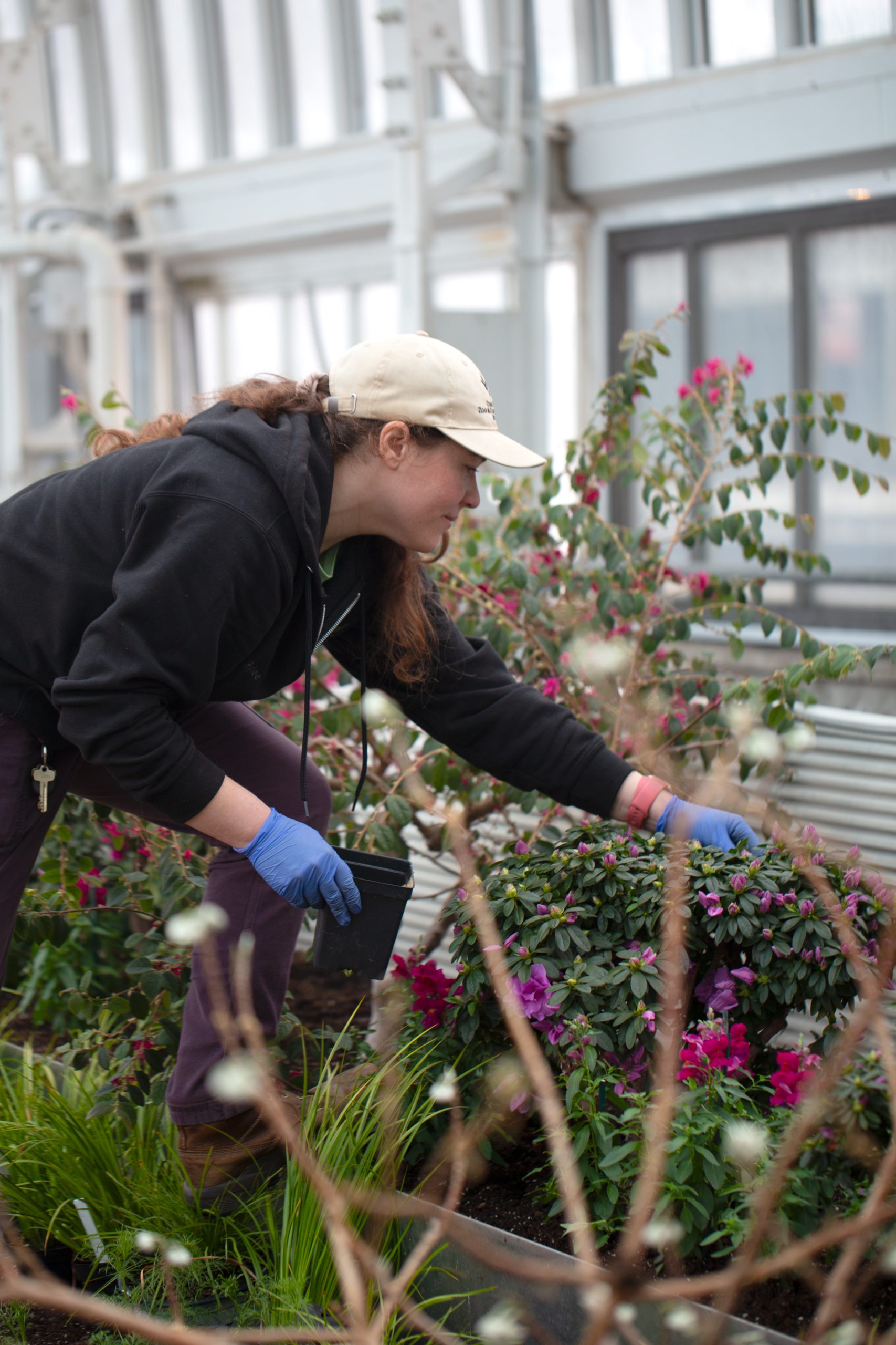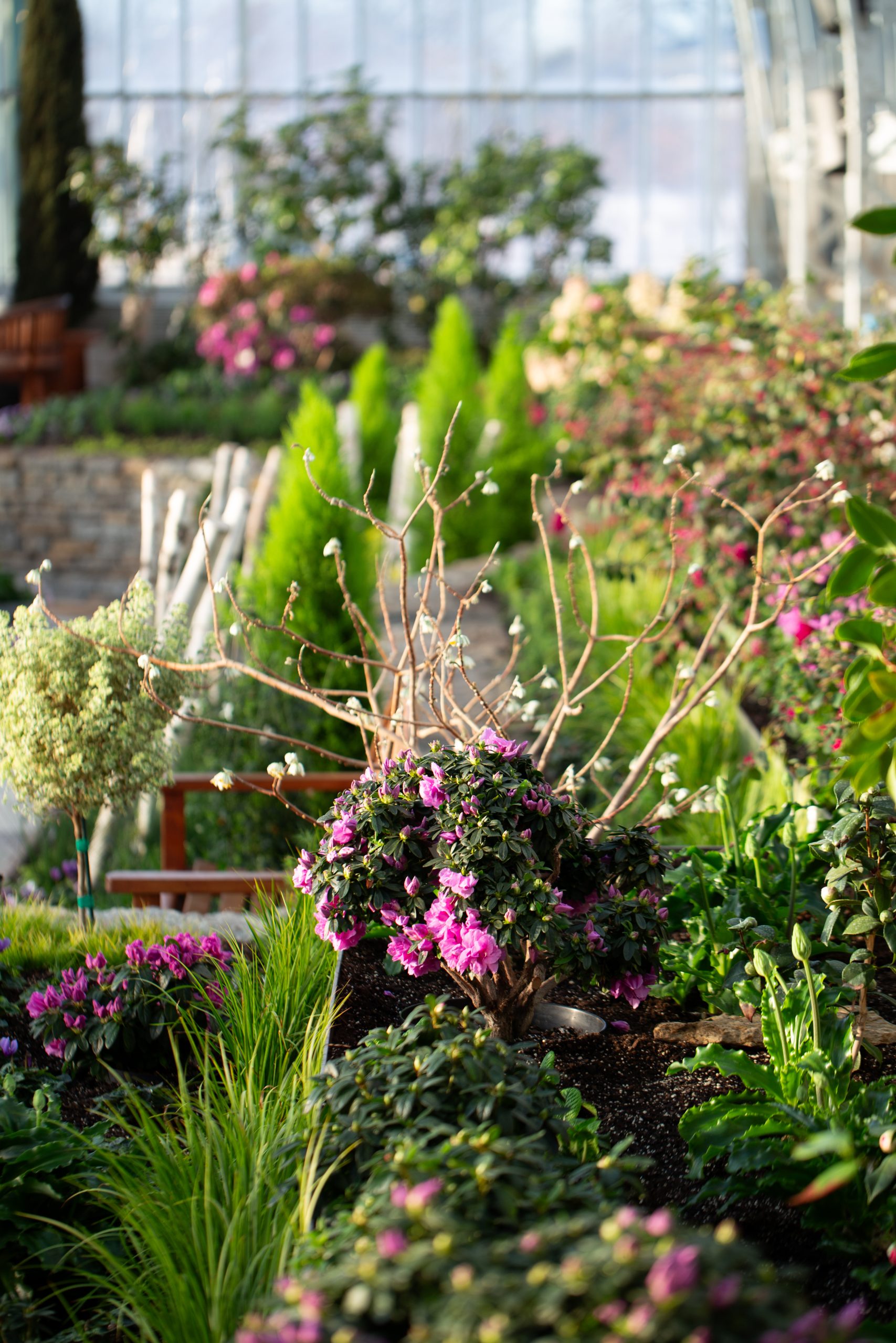 The current Winter Flower Show, now on display through March 15, features a mix of old favorites and new featured plants, with a cool palette of South African veltheimia bulbs, lavender azaleas, pink and white camellias, tropical hibiscus, and more. “I wanted to pay homage to some of the history that’s happened in the room by bringing in some of our accent plants, jasmine topiaries and some lemon cypress. But I also wanted to move the room in a new direction where our interests can always be changing,” Zaman says.