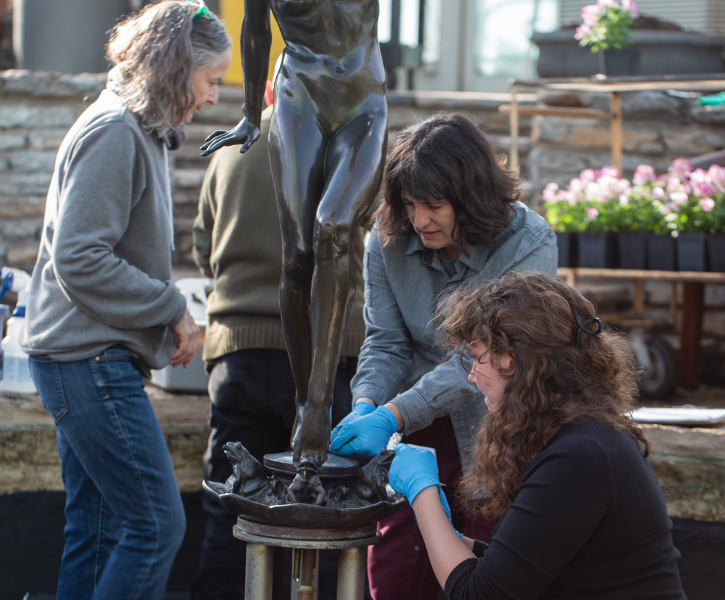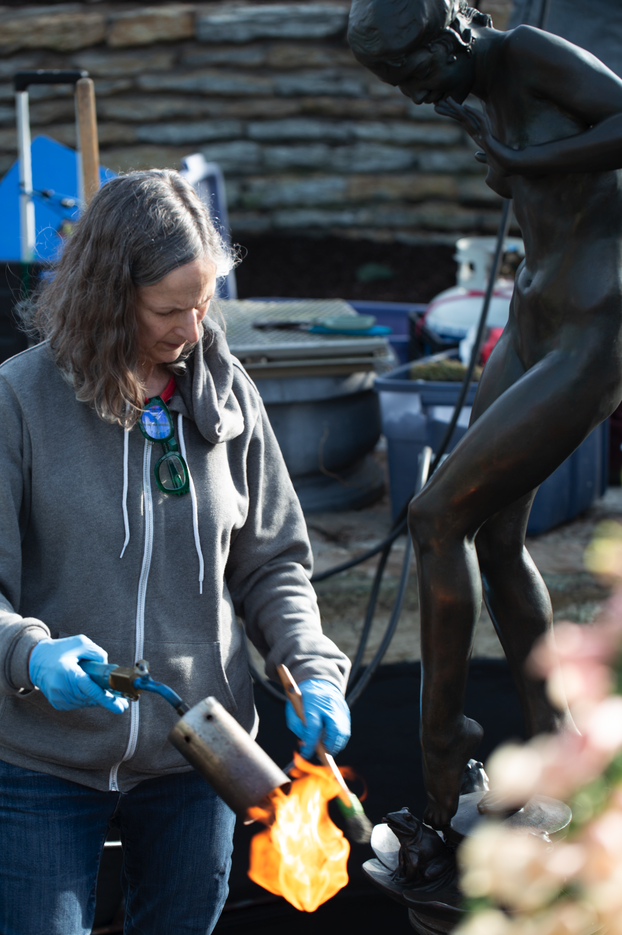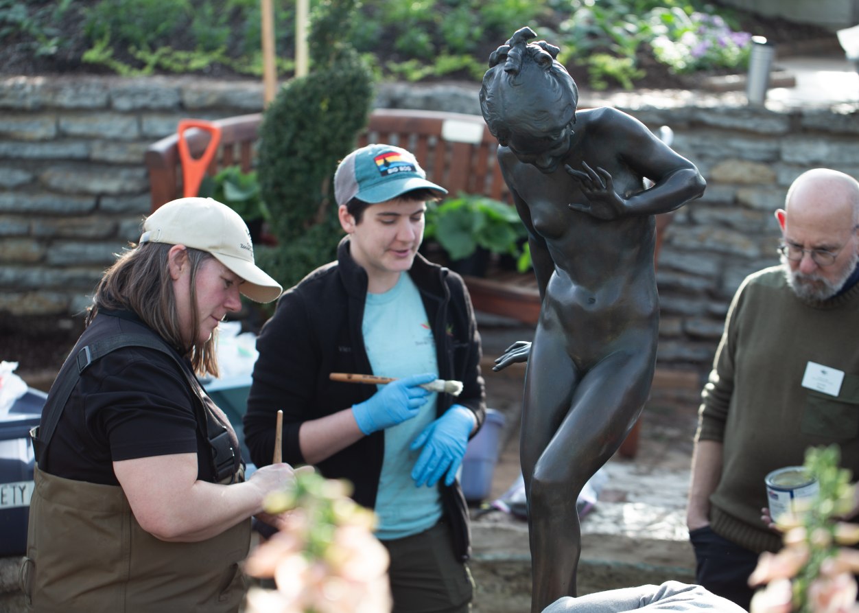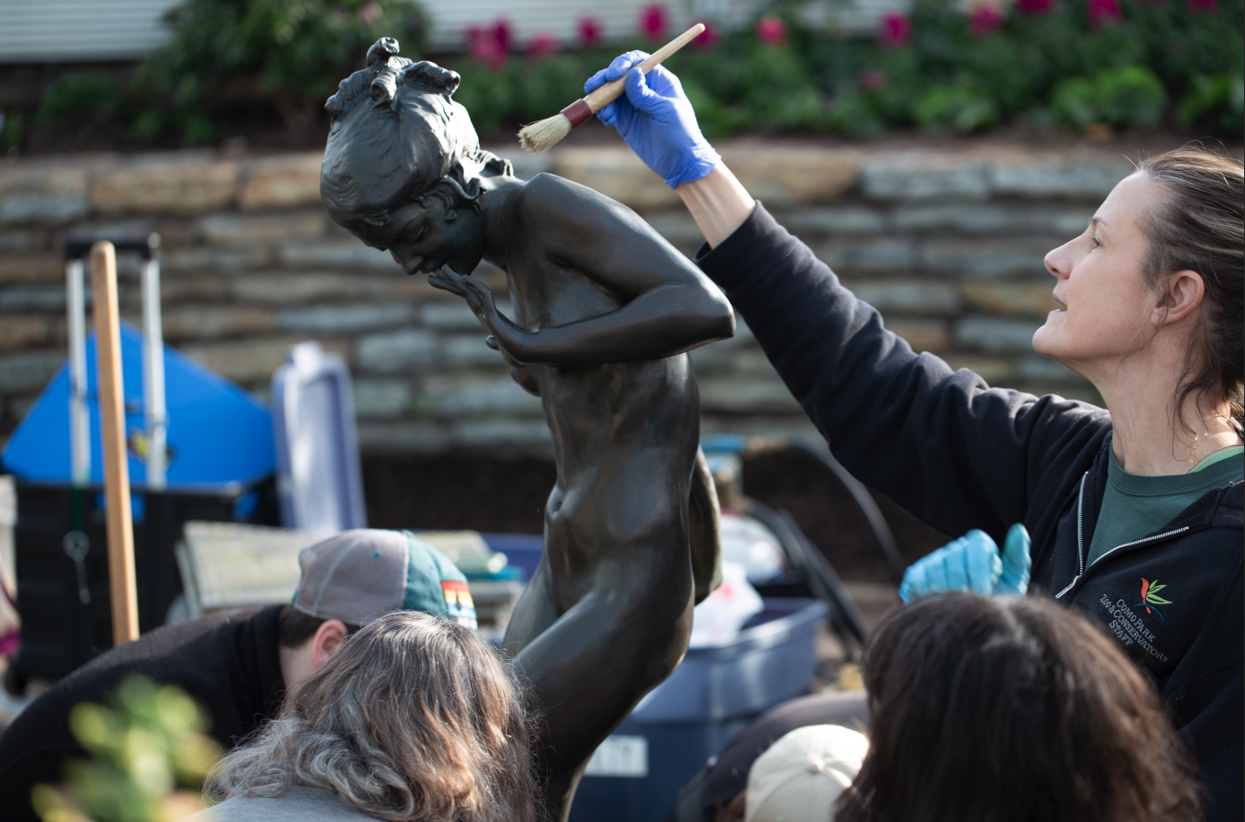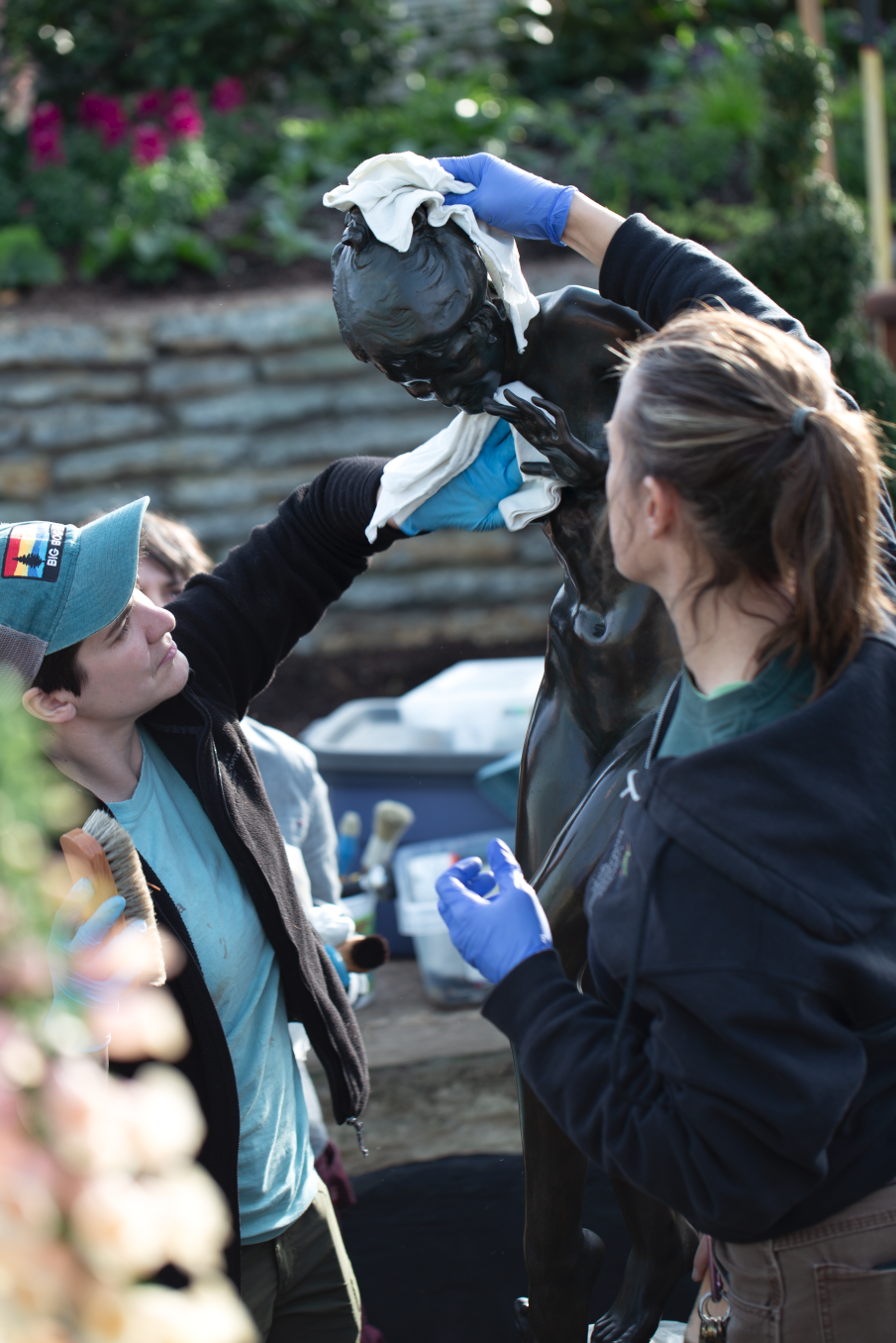 2). Como horticulturist Bryn Fleming helps give the statue a full cleaning, removing accumulated grime and buildup on the metal. During the process, older wax is stripped from the statue to allow conservators to reapply a new protective layer.