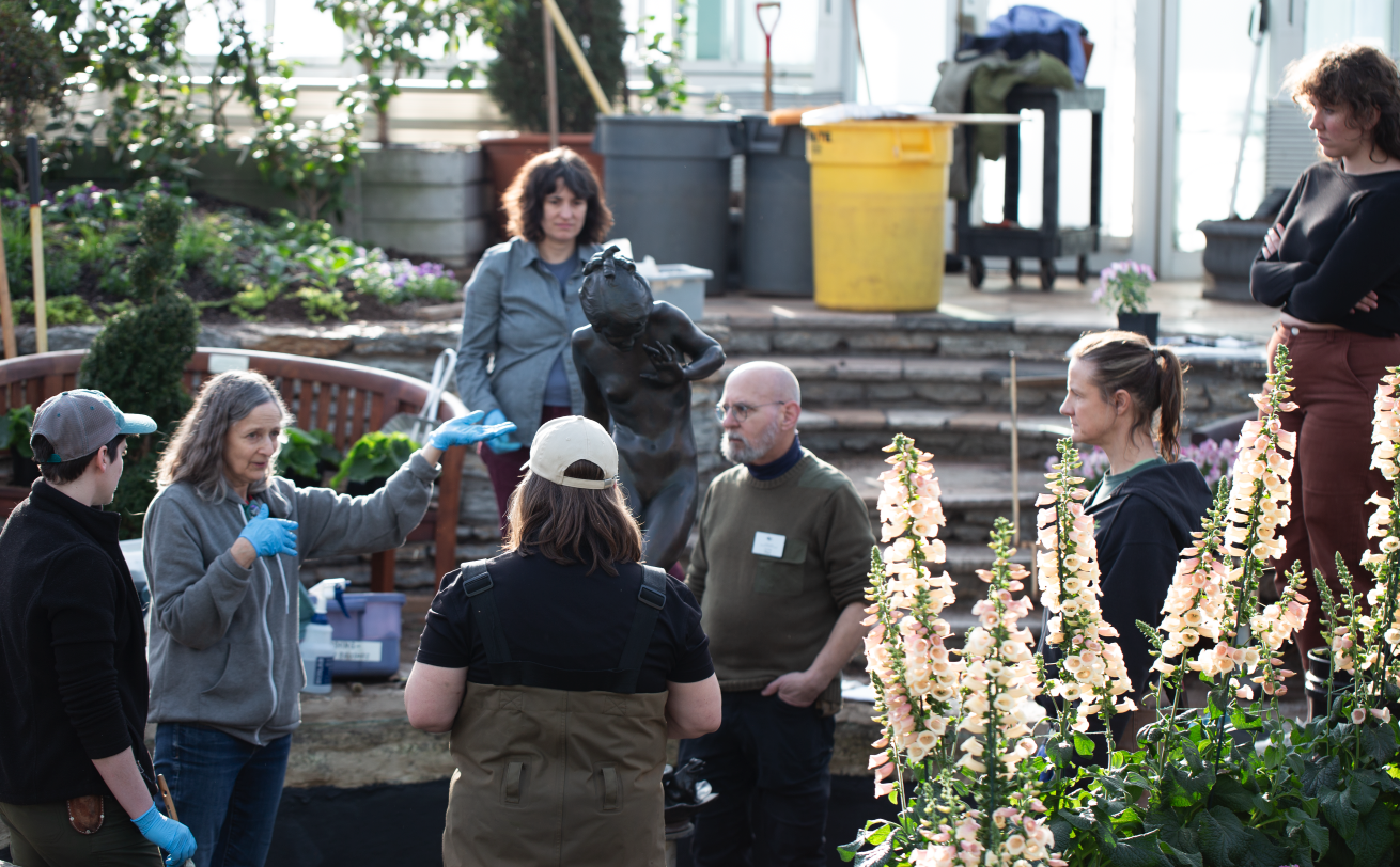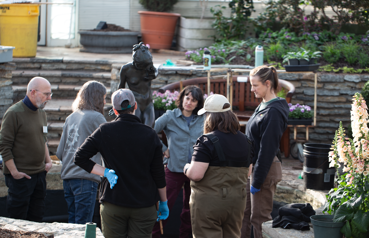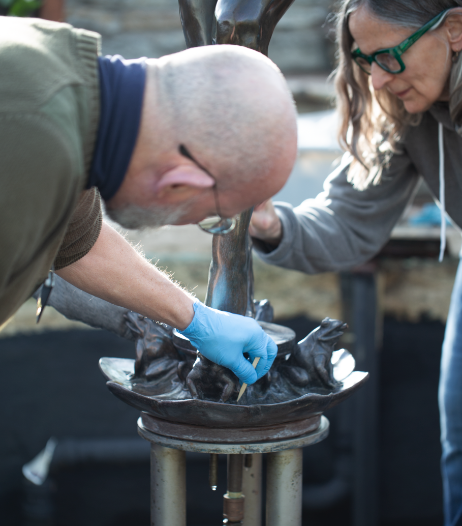 1). When decades of wear and tear split the copper tubes feeding water to the bubbling frogs on “Play Days,” Como entrusted their replacement to KCI Conservation, a Minneapolis-based art conservation firm. Following a short stay in the studio of conservators Laura Kubick and Kristin Cheronis, the statue was returned to the Sunken Garden for a coordinated treatment and training session about caring for the fountain bronzes.