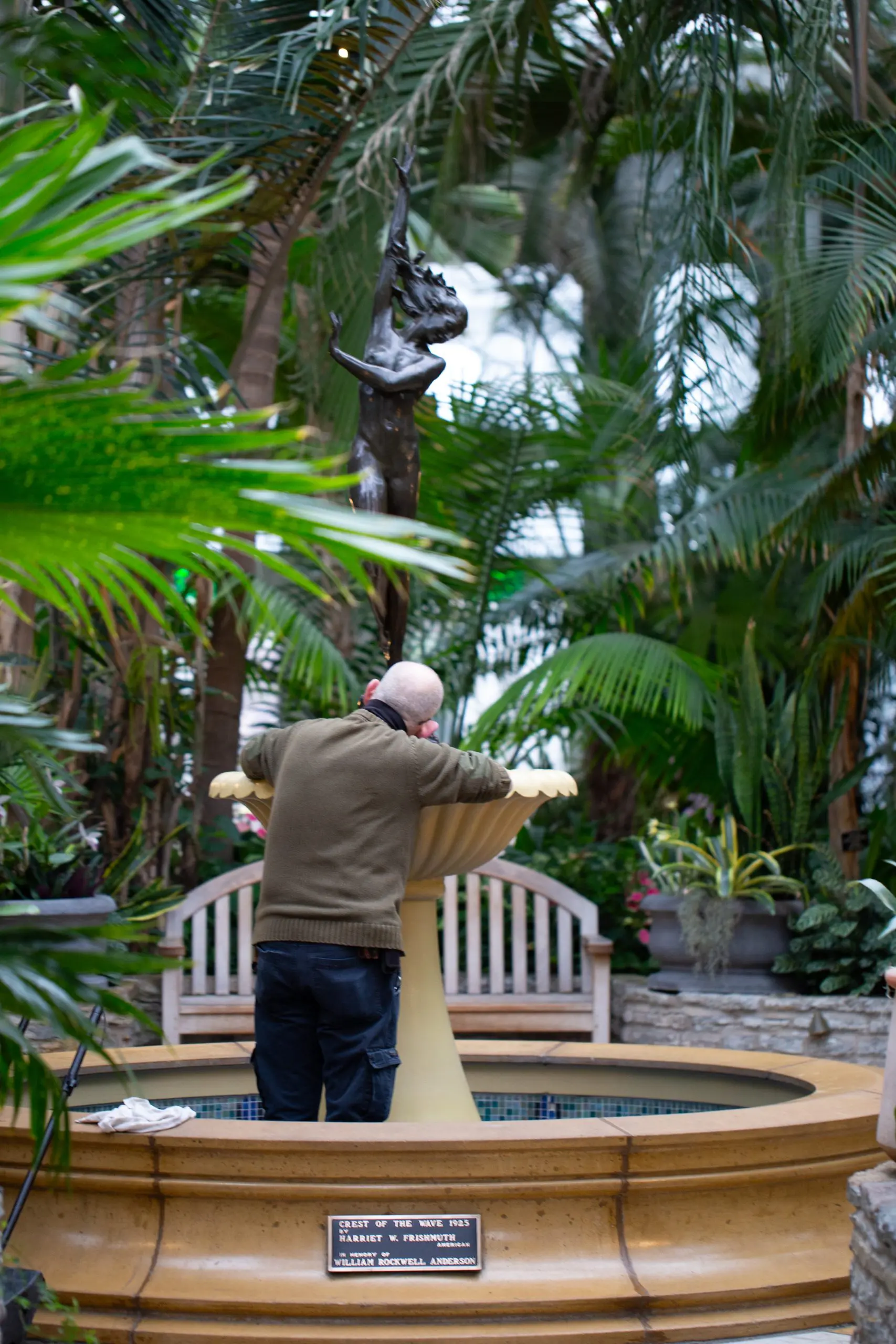 Taking care of Como’s treasures is a team effort that requires the collaboration of Como’s maintenance staff, horticulturists, community volunteers, and outside contractors. Earlier this winter, all of those forces came together to tend to Como’s two most iconic sculptures, “Crest of the Wave” in the Palm Dome, and “Play Days” in the Sunken Garden.